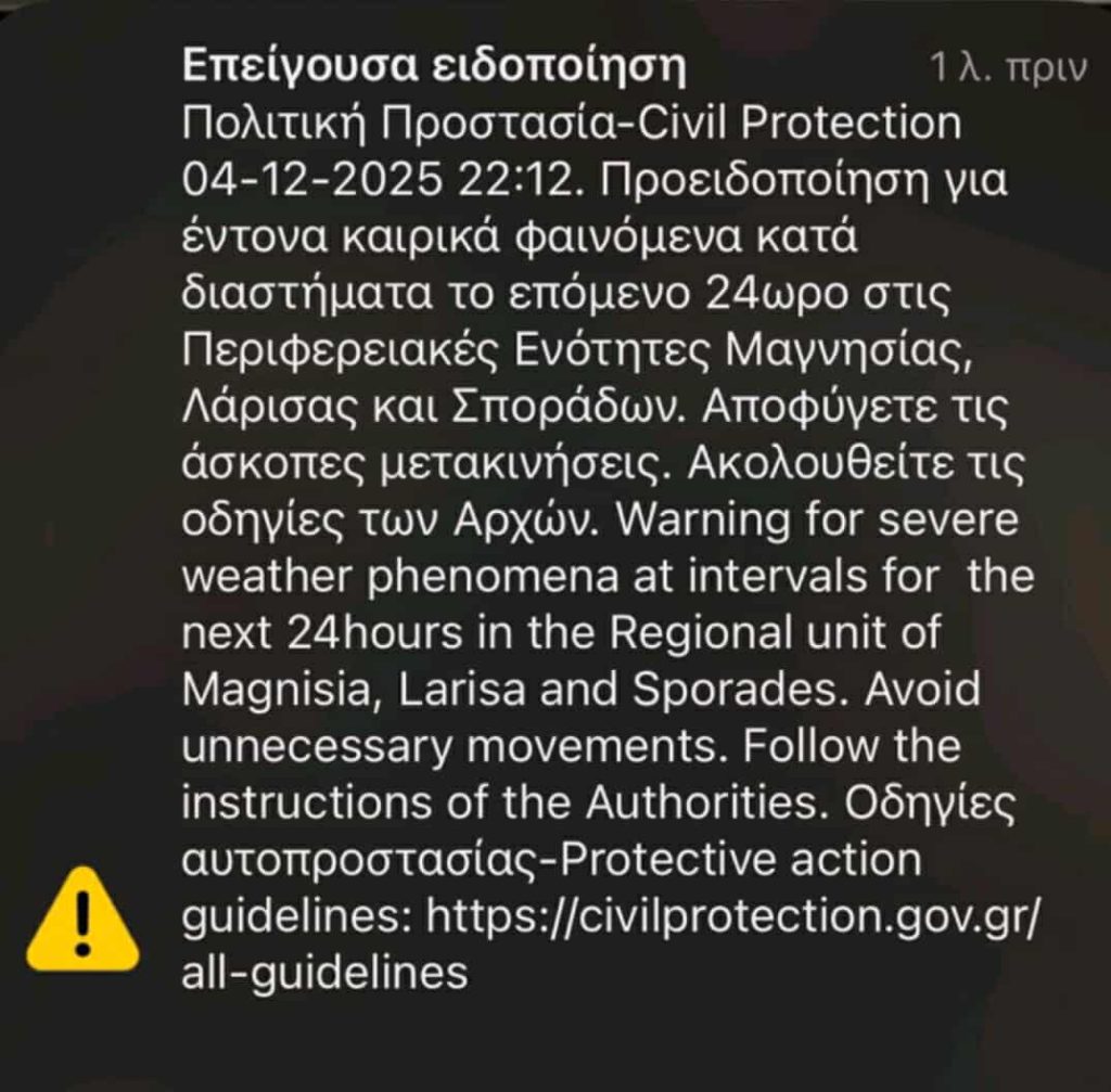Μηνύματα μέσω του 112 για αποφυγή άσκοπων μετακινήσεων ήχησαν το βράδυ της Πέμπτης (04/12), σε μεγάλο μέρος της χώρας. Τα μηνύματα εστάλησαν σε κατοίκους της Μαγνησίας, Λάρισας, Σποράδων, Εύβοιας, Χίου, Σάμου, Ικαρίας, Δωδεκανήσων, Κρήτης και Κυκλάδων προειδοποιώντας τους για έντονα καιρικά φαινόμενα και καλώντας τους να αποφύγουν τις άσκοπες μετακινήσεις.