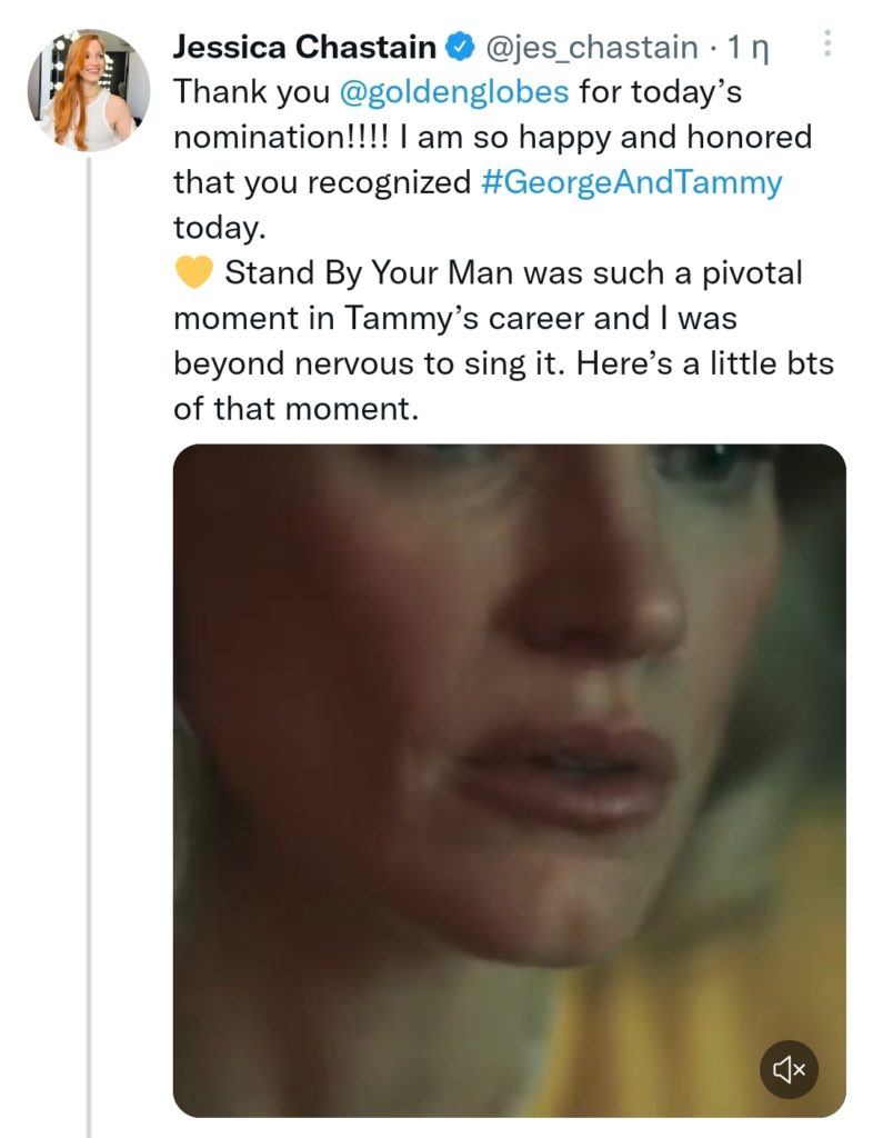 Η περσινή νικήτρια του Όσκαρ καλύτερης ερμηνείας, με tweet ανέφερε: «Σας ευχαριστώ Χρυσές Σφαίρες για τη σημερινή μου υποψηφιότητα. Είμαι πολύ χαρούμενη που αναγνωρίστηκε και τιμήθηκε το George and Tammy».