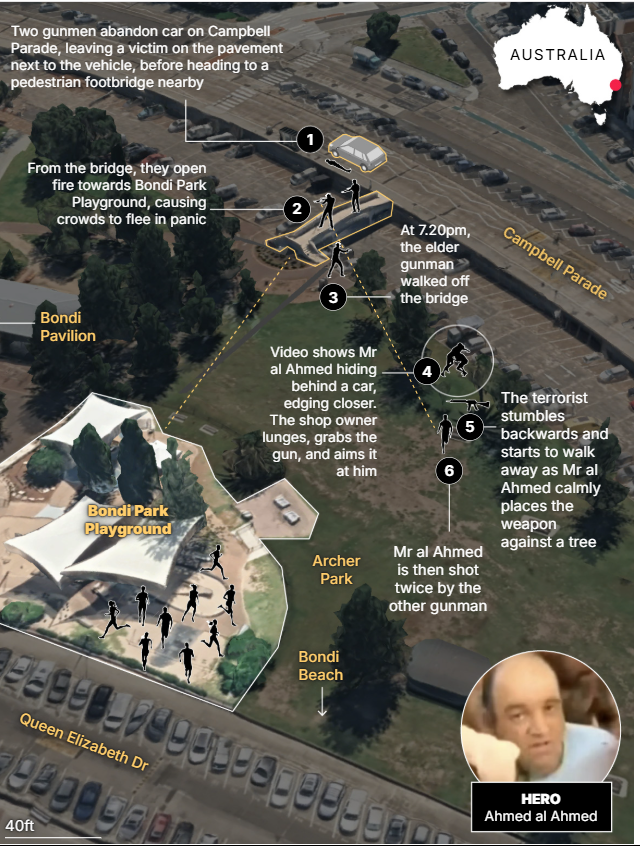 Το περιστατικό συνέβη σε γέφυρα πεζών, λίγα λεπτά αφότου οι δύο ένοπλοι άνοιξαν πυρ σε εκδήλωση για τον εβραϊκό εορτασμό της Χανουκά κοντά στην παραλία.