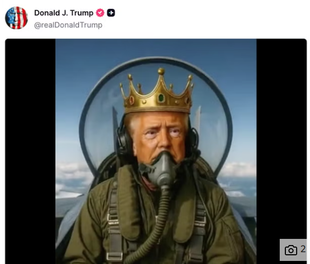 Νέο κύμα αντιδράσεων προκάλεσε ο Ντόναλντ Τραμπ με την ανάρτηση στο Truth Social βίντεο που δημιουργήθηκε με τεχνητή νοημοσύνη και τον απεικονίζει ως «βασιλιά Τραμπ» να πιλοτάρει μαχητικό αεροσκάφος και να «βομβαρδίζει» διαδηλωτές του κινήματος «No Kings» με καφέ υγρό.