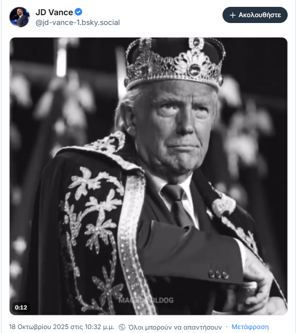 Την ίδια στιγμή και ο αντιπρόεδρος Τζέι Ντι Βανς μοιράστηκε ένα βίντεο που δημιουργήθηκε από τεχνητή νοημοσύνη, όπου ο πρόεδρος των ΗΠΑ φοράει στέμμα και κάπα, ενώ η Νάνσι Πελόζι και άλλοι Δημοκρατικοί γονατίζουν μπροστά του.