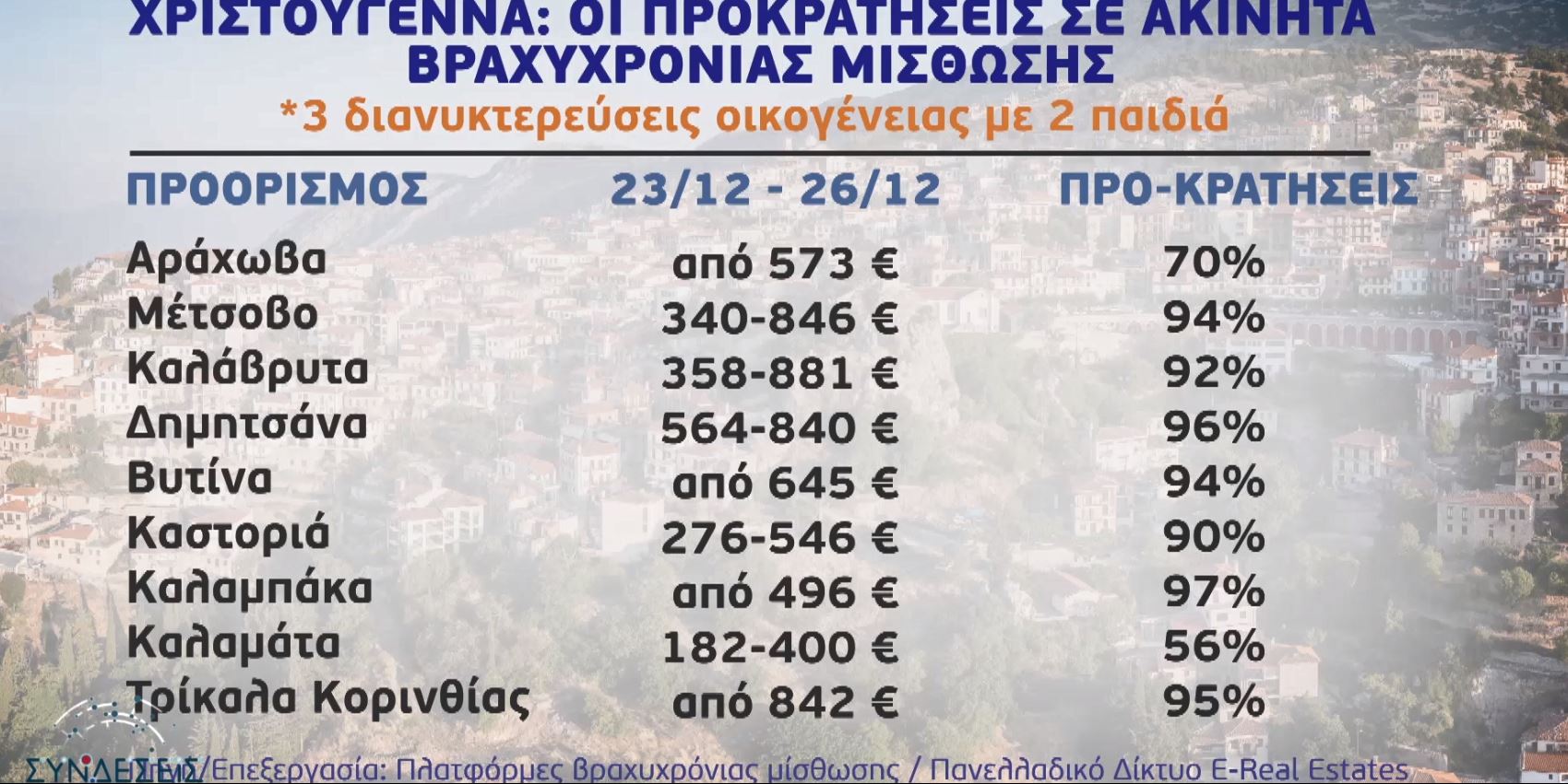 Καλαμπάκα, Τρίκαλα Κορινθίας, Μέτσοβο και Βυτίνα «κονταροχτυπιούνται» για την πρωτιά στην κορυφή των προτιμήσεων. Σύμφωνα με τα στοιχεία από τις πλατφόρμες βραχυγχρόνιας μίσθωσης που επεξεργάστηκε το πανελλαδικό δίκτυο e-real Estates το κόστος για τρεις διανυκτερεύσεις οικογένειας με 2 παιδιά (από 23/12 – 26/12) ξεκινάει από 182 € – 400 (Καλαμάτα) και φτάνει τα 842 (Τρίκαλα Κορινθίας).
