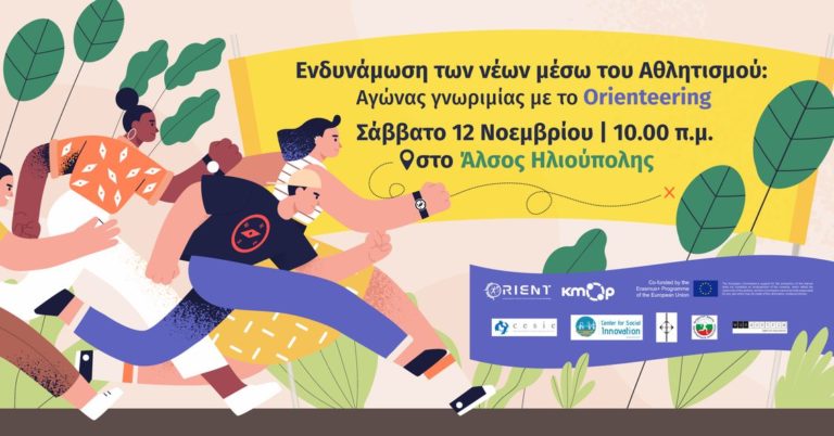 To KMOΠ – Κέντρο Κοινωνικής Δράσης και Καινοτομίας και ο Πανελλήνιος Σύλλογος Εκπαιδευτικών για το Orienteering σας προσκαλούν να συμμετάσχετε σε αθλητική εκδήλωση για τους νέους και αγώνα γνωριμίας με το orienteering, που θα πραγματοποιηθεί το Σάββατο 12 Νοεμβρίου, στις 10π.μ., στο Άλσος Ηλιούπολης (είσοδος από Μνησικλέους).