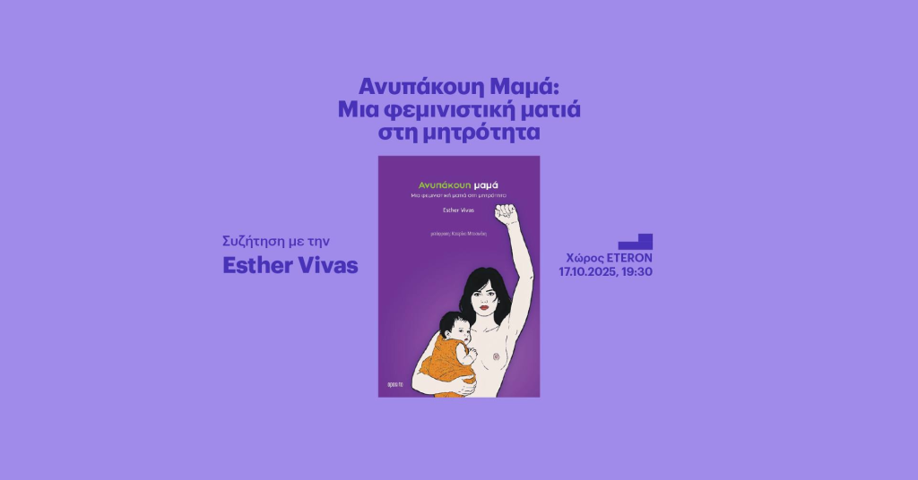 Με αφορμή την έκδοση του βιβλίου “Ανυπάκουη Μαμά: Μια φεμινιστική ματιά στη μητρότητα”, οι εκδόσεις oposito διοργανώνουν ομιλία/συζήτηση με την συγγραφέα Esther Vivas, την Παρασκευή 17 Οκτωβρίου στις 19:30, στον χώρο του Eteron (Λεωκορίου 38-40, Αθήνα).