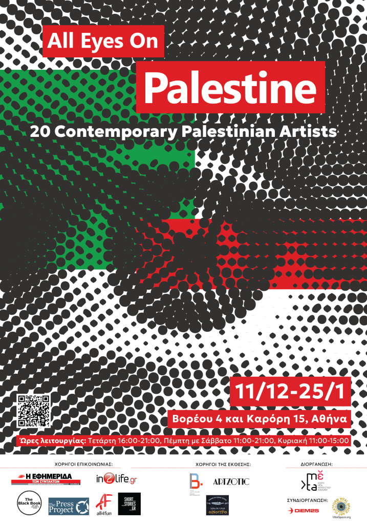Η έκθεση-ορόσημο της σύγχρονης παλαιστινιακής τέχνης, «All Eyes on Palestine» ανοίγει τις πόρτες της την Πέμπτη 11 Δεκεμβρίου 2025 στην καρδιά του ιστορικού κέντρου της Αθήνας (Καρόρη 15 & Βορέου 4). Η έκθεση τιμά 20 Παλαιστίνιους καλλιτέχνες που γεννήθηκαν μεταξύ των δύο Ιντιφάντα και τώρα εργάζονται στη Γάζα, τη Δυτική Όχθη, τη Γαλλία, το Ηνωμένο Βασίλειο και αλλού.