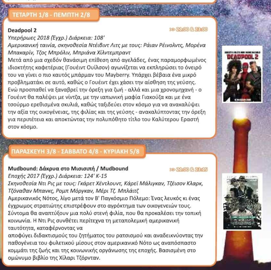 Συνεχίζονται οι προβολές στο Δημοτικό Θερινό Κινηματογράφο “Σινέ Πετρούπoλις”,(25ης Μαρτίου 168, τηλ. 2105012391), έως και τις 16 Σεπτεμβρίου.
