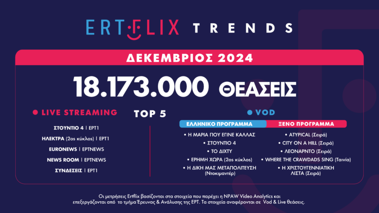 Ο Δεκέμβριος έκλεισε με 18.173.000 θεάσεις, ενώ οι VOD θεάσεις έφτασαν σε ιστορικό υψηλό 15.200.000 (+23% από τον Δεκέμβριο 2023).