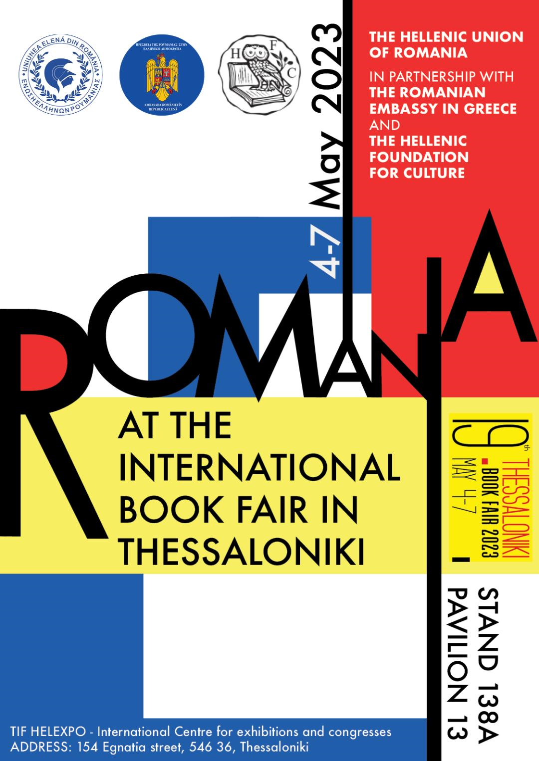 Η Ένωση Ελλήνων της Ρουμανίας διοργανώνει μεταξύ 4-7 Μαΐου 2023, με την υποστήριξη της Πρεσβείας της Ρουμανίας στην Ελληνική Δημοκρατία και του Ελληνικού Ιδρύματος Πολιτισμού με έδρα την Αθήνα, τη Ρουμανική συμμετοχή στη 19η Έκθεση Βιβλίου της Θεσσαλονίκης, η μοναδική υψηλού επιπέδου εκδήλωση στην Ελλάδα, υπό την αιγίδα της Προέδρου της Ελληνικής Δημοκρατίας, Κατερίνας Σακελλαροπούλου.