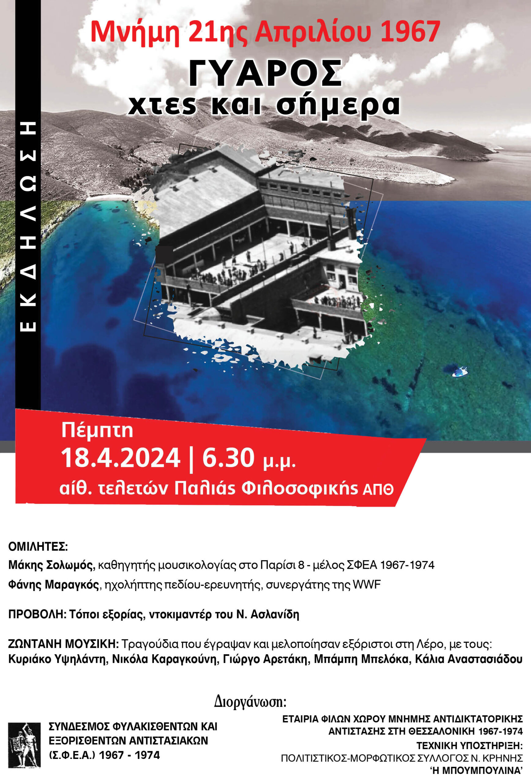 Ο Σύνδεσμος Φυλακισθέντων και Εξορισθέντων Αντιστασιακών 1967- 1974 (ΣΦΕΑ ), εν όψει της 57ης επετείου του πραξικοπήματος των συνταγματαρχών στις 21/4/1967, θα πραγματοποιήσει εκδήλωση στις 18 Απριλίου 2024, στις 6.30 μ.μ., στην αίθουσα τελετών της παλαιάς Φιλοσοφικής Σχολής του ΑΠΘ, που θα είναι τιμητικά αφιερωμένη στους 7.500 και πλέον δημοκρατικούς πολίτες, ανάμεσά τους 300 γυναίκες – πολλές άφησαν πίσω μικρά παιδιά – που εξορίστηκαν στη Γύαρο (Γιούρα) την περίοδο της 7χρονης τυραννίας – μεταξύ τους και 500 περίπου ‘προληπτικώς εκτοπισθέντες’ από την περιοχή Θεσσαλονίκης και τη Β.Ε.