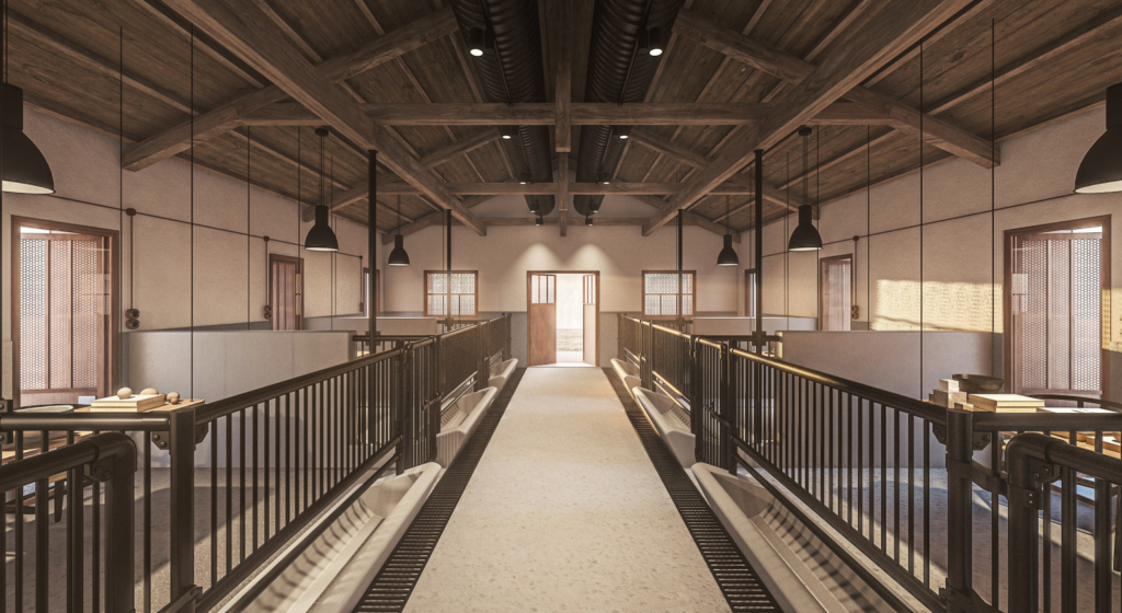 Με σεβασμό στη βιομηχανική αρχιτεκτονική του κτηρίου γίνονται οι αναγκαίες μετασκευές, ώστε να εξυπηρετηθεί η νέα χρήση. Για παράδειγμα, οι ταΐστρες και τα κιγκλιδώματα στους χώρους σταυλισμού διατηρούνται και χρησιμοποιούνται ως σημεία πώλησης. Στις ανοιχτές στάμνες – γούρνες χωροθετούνται οι χώροι υγιεινής. Οι πολλαπλές αυλές κατά μήκος της ανατολικής και της δυτικής όψης αναδεικνύονται και συνδυάζονται με τη νέα χρήση. Έμφαση δίνεται στο σεβασμό της υπάρχουσας μορφολογίας και τυπολογίας του κτηρίου, στην ανάδειξη των αξιόλογων χαρακτηριστικών του, στην αποκατάσταση του περιβάλλοντος χώρου του μνημείου και στη σωστή επανένταξή του στο ευρύτερο σύνολο του κτήματος.