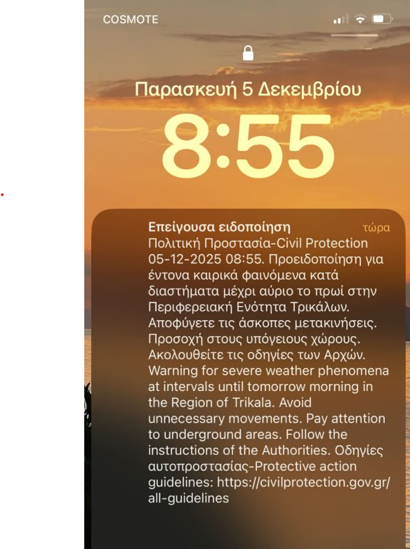 Ισχυρά και επικίνδυνα φαινόμενα πλήττουν τους νομούς Τρικάλων και Καρδίτσας. Το πρωί της Παρασκευής εστάλη στους κατοίκους μήνυμα από το 112 ώστε να αποφεύγονται οι άσκοπες μετακινήσεις κατά τη διάρκεια του 24ώρου.