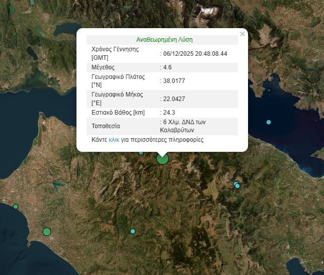 Σεισμός 4,6 Ρίχτερ σημειώθηκε το βράδυ του Σαββάτου (6/12) στα Καλάβρυτα.