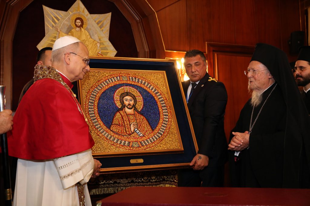 Από την πλευρά του, ο Πάπας Λέων ΙΔ’ δώρισε στον Πατριάρχη Βαρθολομαίο ένα ψηφιδωτό με την εικόνα του Παντοκράτορα, ένα έργο που παραπέμπει στην κοινή χριστιανική παράδοση και στην τέχνη των πρώτων αιώνων της Εκκλησίας.