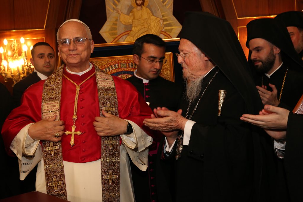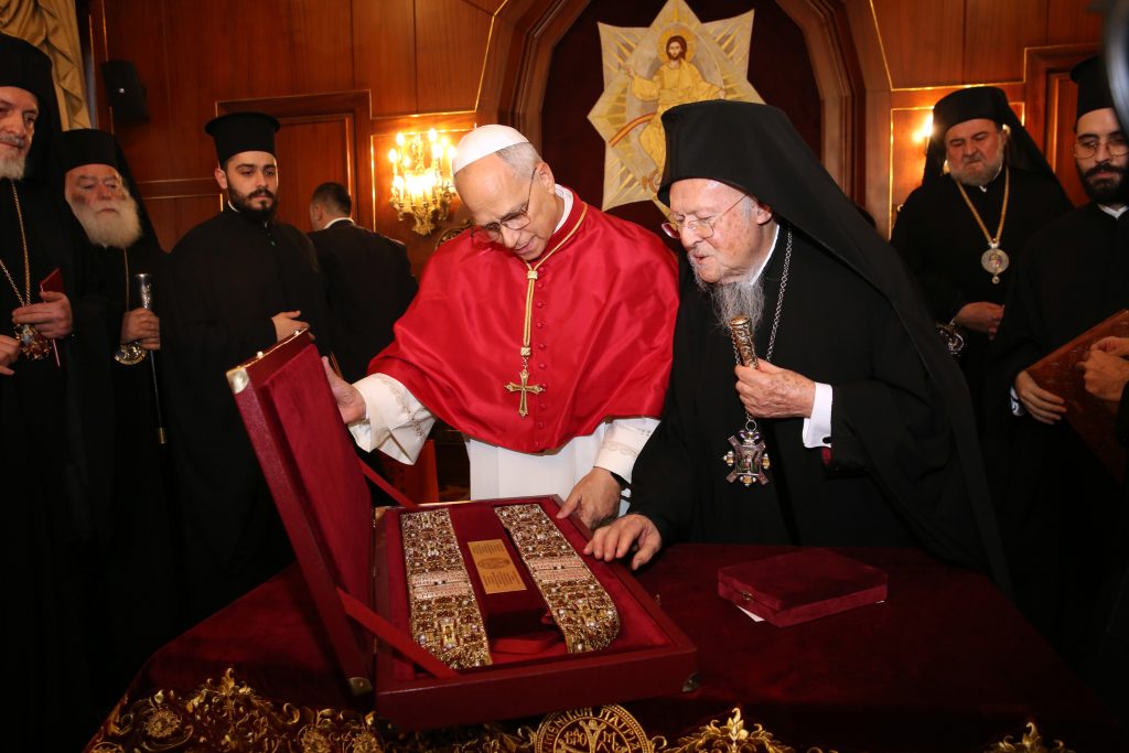 Ο Οικουμενικός Πατριάρχης προσέφερε στον Επίσκοπο Ρώμης ένα πετραχήλι και έναν σταυρό, δώρα με βαθιά λειτουργική και πνευματική σημασία, που αντανακλούν το ποιμαντικό έργο και την αποστολή του Πάπα.