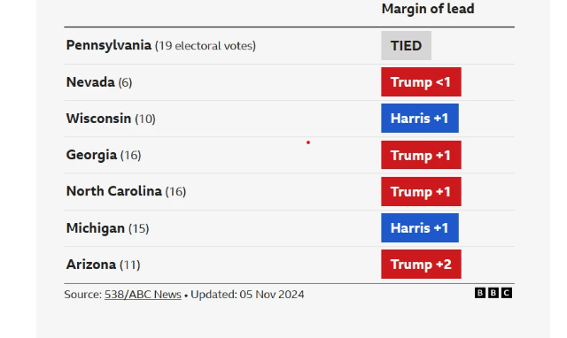 Κανείς δεν μπορεί να πάρει σοβαρά τις δημοσκοπήσεις, μεταδίδει το BBC, με σχόλιο ότι οι δύο υποψήφιοι είχαν εκ διαμέτρου αντίθετα προεκλογικά συνθήματα κι όμως συμπίπτουν στα ποσοστά. Η Κάμαλα Χάρις πρόταξε τη μάχη κατά της ακρίβειας και το δικαίωμα στις αμβλώσεις, ενώ ο Ντόναλντ Τραμπ τις φορολογικές περιοκπές αλλά και το κλείσιμο των συνόρων σε μετανάστες, σύμφωνα με το βρετανικό δίκτυο.