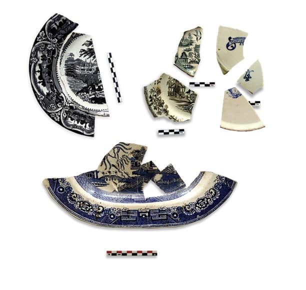 Τα είδη και ο διάκοσμος των κεραμικών σκευών παρουσιάζει αξιοσημείωτη ποικιλία. Μεγάλος αριθμός θραυσμάτων ανήκει σε σκεύη αγγλικών εργαστηρίων των περιοχών Staffordshire και Swansea και αποτελούν χαρακτηριστικά δείγματα δύο βασικών τεχνικών της διακόσμησης “transfer ware”, γνωστών ως China Βlue και Flow Blue. Ως προς το θέμα του διακόσμου κυριαρχούν τα «Willow» και ο «Wild Rose Nuneham Courtnay», ενώ περιορισμένος αριθμός πιάτων φέρουν παραστάσεις όπως η «Δαμασκός», η «Λαχώρη», ο «Βόσπορος» κ.ά. Θραύσματα τεσσάρων πιάτων εικονίζουν το βασιλικό ζεύγος της Σουηδίας, Όσκαρ και Ζοζεφίνα· επετειακό θέμα που κυκλοφόρησε με αφορμή της ανάρρησής τους στον θρόνο το 1844. Αγγλικής προέλευσης είναι και σκεύη με ανθικό διάκοσμο κατασκευασμένο με την τεχνική του σπόγγου (spongeware). Στην κατηγορία «Μocha» ανήκουν κούπες και ίσως κανάτες με χαρακτηριστικό διάκοσμο από επάλληλες ταινίες γαλάζιου, μπλε και πράσινου και το σχέδιο της σκακιέρας που διακρίνονται για το ιδιαίτερα στιλπνό υάλωμα και χρονολογούνται στα τέλη του 19ου αι., όπως και θραύσματα από σετ πρωινού, τα οποία προορίζονταν κυρίως για τις αγορές των μεγάλων πόλεων της Τουρκίας στα Βαλκάνια και στην Ανατολή.