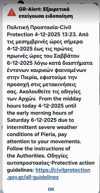 Παράλληλα από την Πολιτική Προστασία έχει σταλεί μήνυμα σε κατοίκους της περιοχής της Πιερίας, για έντονα καιρικά φαινόμενα από τις μεσημβρινές ώρες σήμερα (4/12) μέχρι τις πρωινές ώρες του Σαββάτου (6/12).