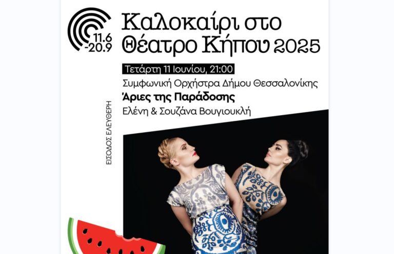 Η αυλαία του Φεστιβάλ «Καλοκαίρι στο Θέατρο Κήπου 2025» ανοίγει με τη Συμφωνική Ορχήστρα Δήμου Θεσσαλονίκης και την υπέροχη σύμπραξή με τις Ελένη και Σουζάνα Βουγιουκλή, σε μια μουσική γιορτή ανοιχτή για όλους, με ελεύθερη είσοδο.