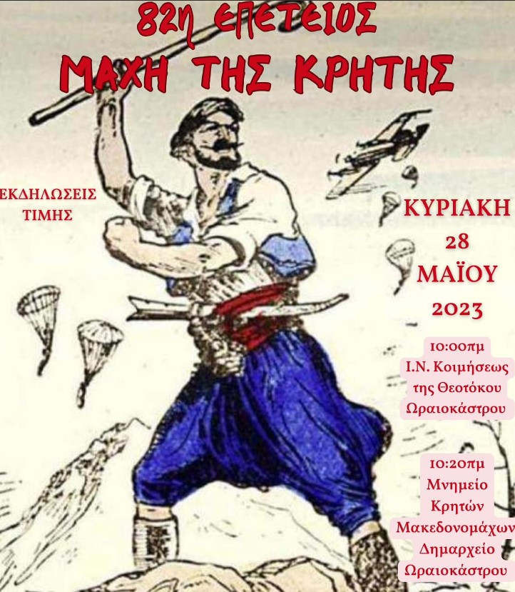 Ο Δήμος Ωραιοκάστρου και ο Σύλλογος Κρητών Ωραιοκάστρου και Φίλων «Ερωτόκριτος» τιμούν τους ήρωες της Μάχης της Κρήτης και συνδιοργανώνουν εκδηλώσεις μνήμης στο πλαίσιο της 82ης επετείου της Μάχης, την Κυριακή, 28 Μαΐου 2023.