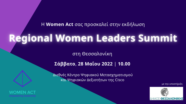 Το Regional Women Leaders Summit αποτελεί μια ακόμη πρωτοβουλία της Women Act που οραματίζεται το μέλλον με κυρίαρχο το δικαίωμα των γυναικών στις ίσες ευκαιρίες. Ένα μέλλον στο οποίο οι γυναίκες διεκδικούν και κατέχουν ενεργό ρόλο στις θέσεις εξουσίας και ηγεσίας, καθώς και στα κέντρα λήψης αποφάσεων. Η Women Act είναι μία μη κυβερνητική, μη κομματική οργάνωση που ιδρύθηκε το 2017 με σκοπό την ενδυνάμωση των γυναικών σε όλους τους επαγγελματικούς χώρους και τα κοινωνικά στρώματα έτσι ώστε να αναπτύξουν πλήρως τις κοινωνικές, πολιτισμικές, οικονομικές και επιχειρηματικές δυνατότητές τους. Στο πλαίσιο των στόχων της η Women Act διοργανώνει την πρώτη μεγάλη περιφερειακή της εκδήλωση με θέμα τις ηγέτιδες που διαπρέπουν στην Β. Ελλάδα και όχι μόνο. Το Regional Women Leaders Summit θα φιλοξενήσει ομιλήτριες από τον χώρο της πολιτικής, της κοινωνίας των πολιτών και του επιχειρηματικού κόσμου, και θα φέρει στο προσκήνιο εμπειρίες, προκλήσεις αλλά και ευκαιρίες για την ηγέτιδα στην δημόσια σφαίρα. Το Regional Women Leaders Summit θα πραγματοποιηθεί στη Θεσσαλονίκη, στο Διεθνές Κέντρο Ψηφιακού Μετασχηματισμού & Ψηφιακών Δεξιοτήτων, το Σάββατο 28 Μαΐου και ώρες 10.00 – 13.00, με την υποστήριξη του Δήμου Θεσσαλονίκης.