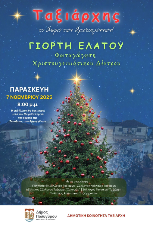 Ο Δήμος Πολυγύρου – Δημοτική Κοινότητα Ταξιάρχη διοργανώνουν τη «Γιορτή Ελάτου» την Παρασκευή 7 Νοεμβρίου 2025, στις 20:00, αμέσως μετά τον Μέγα Εσπερινό, στην πλατεία του Ταξιάρχη.