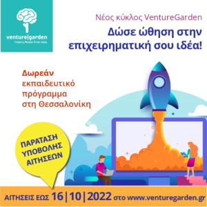 Λήξη προθεσμίας υποβολής αιτήσεων: 16 Οκτωβρίου 2022. Για περισσότερες πληροφορίες και για να συμπληρώσετε την αίτηση επισκεφτείτε το www.venturegarden.gr ή καλέστε στο 2310 398347.