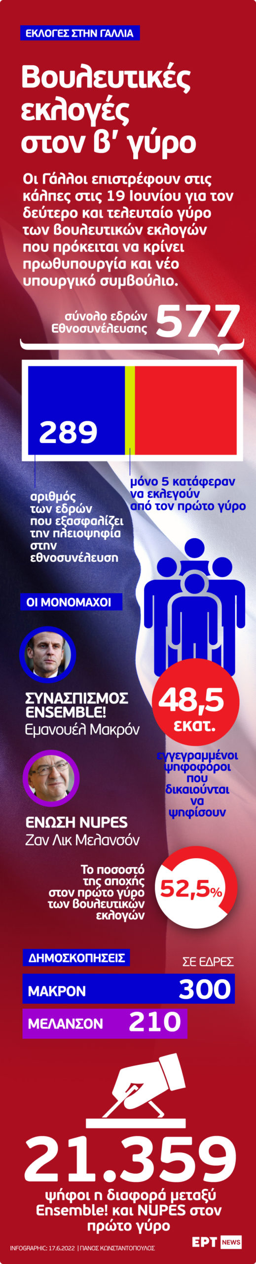 Στις κάλπες καλούνται να προσέλθουν ξανά στις 19 Ιουνίου, περίπου 49 εκατομμύρια πολίτες, για τον δεύτερο γύρο των βουλευτικών εκλογών στη Γαλλία. Το ποσοστό της αποχής στον πρώτο γύρο ήταν σχεδόν 53% και η διαφορά μεταξύ Ensembe! και Nupes «άγγιξε» τις 21.000 ψήφους.