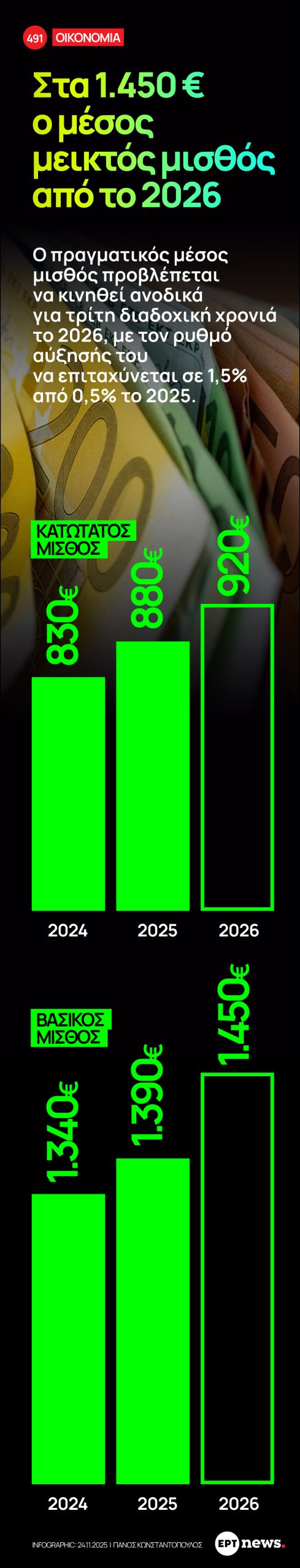 Ο πραγματικός μέσος μισθός αναμένεται να κινηθεί ανοδικά το 2026 για τρίτη διαδοχική χρονιά με τον ρυθμό αύξησής του να επιταχύνεται σε 1,5%.