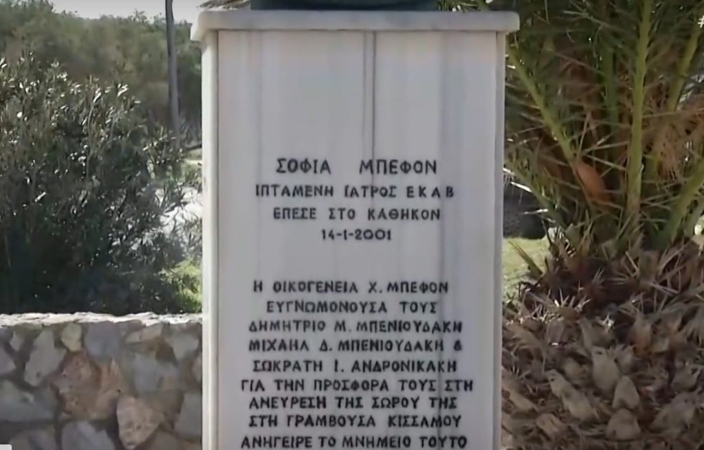 Τη μνήμη της Σοφίας Μπεφόν και των υπόλοιπων επιβαινόντων της μοιραίας πτήσης του ελικοπτέρου του ΕΚΑΒ, που συνετρίβη το 2001 τίμησαν οι συγγενείς, πολίτες και συνάδελφοι στην Κίσσαμο Χανίων.