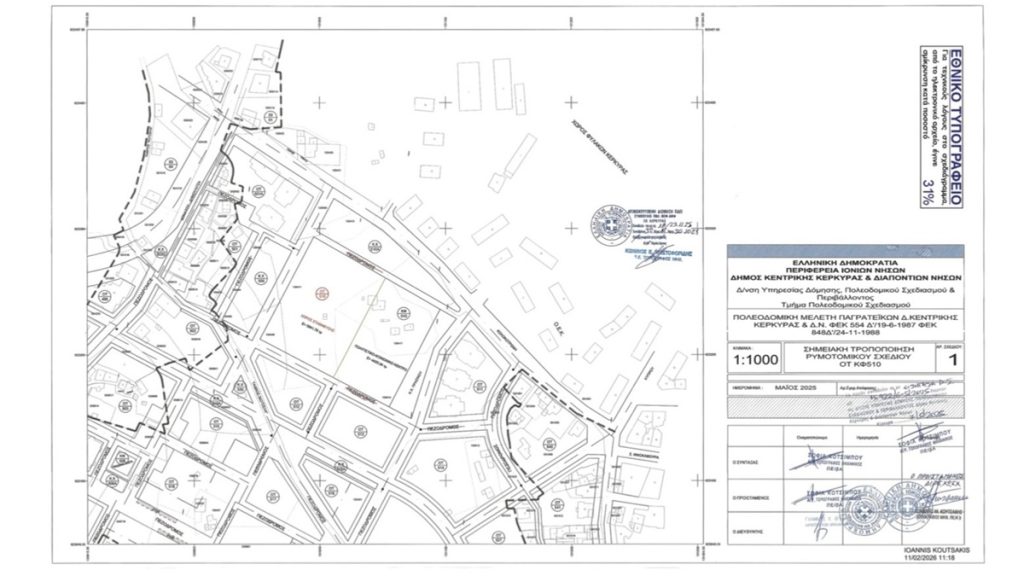 Οριστικοποιήθηκε θεσμικά μια σημαντική εξέλιξη για την πόλη της Κέρκυρας, που αντιμετωπίζει τεράστιο πρόβλημα με τις θέσεις πάρκινγκ, καθώς δημοσιεύθηκε στην Εφημερίδα της Κυβερνήσεως (ΦΕΚ Δ’ 111/18.02.2026) η έγκριση της σημειακής τροποποίησης του ρυμοτομικού σχεδίου της Πολεοδομικής Μελέτης «Παγκρατέικων» του Δήμου Κεντρικής Κέρκυρας