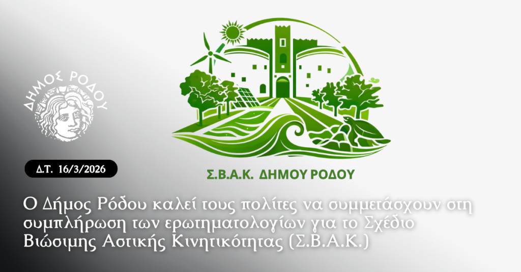 Ο Δήμος Ρόδου απευθύνει ανοικτή πρόσκληση στους δημότες να συμμετάσχουν ενεργά στη διαμόρφωση του Σχεδίου Βιώσιμης Αστικής Κινητικότητας (Σ.Β.Α.Κ) καταθέτοντας τις απόψεις και τις εμπειρίες τους για τις μετακινήσεις στην πόλη.