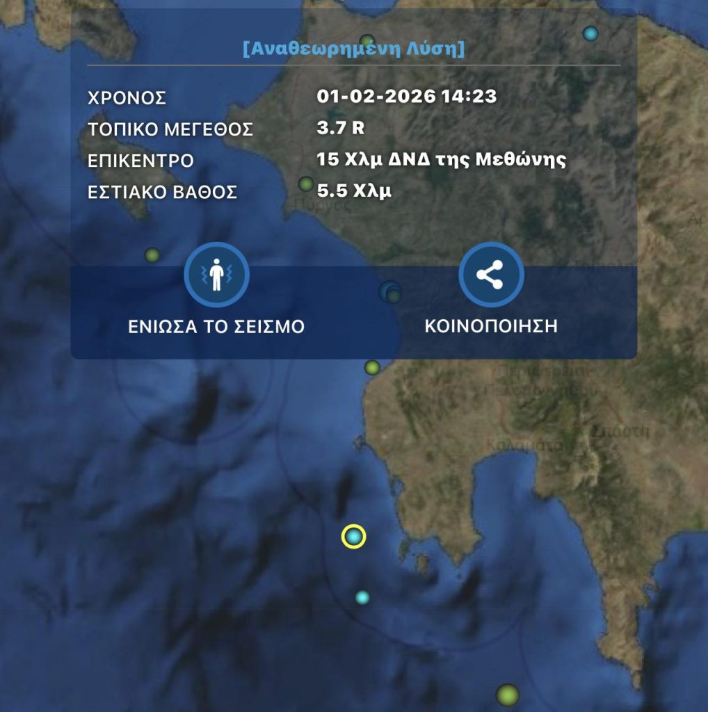 Ασθενής σεισμική δόνηση σημειώθηκε σήμερα το μεσημερι, ανοιχτά της Μεθώνης, στο θαλάσσιο χώρο.