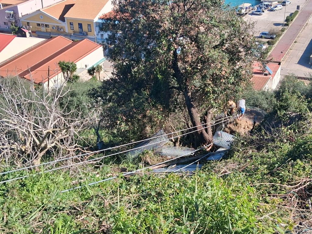 Το συνεργείο ήδη τοποθετεί συρματοπλέγματα γύρω από τον βράχο, για να συγκρατηθούν τα θραύσματα και να τηρηθούν όλες οι προδιαγραφές ασφαλείας.