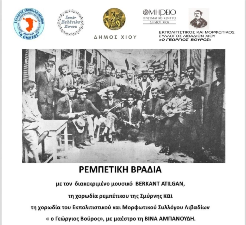 Ενα μοναδικό μουσικό αφιέρωμα στην κοινή πολιτιστική κληρονομιά του Αιγαίου, μέσα από μια καλλιτεχνική σύμπραξη που ενώνει τις δύο πλευρές, πραγματοποιεί ο Σύλλογος Ενοικιαζομένων Δωματίων, Διαμερισμάτων και Τουριστικών Επιπλωμένων Κατοικιών Χίου «Ο ΟΜΗΡΟΣ».Πρόκειται για ένα ταξίδι με οδηγό το ρεμπέτικο τραγούδι και τη συμμετοχή