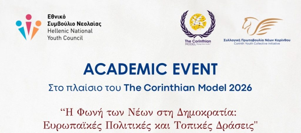 Η Επιτροπή Ευρωπαϊκών Υποθέσεων και η Επιτροπή Αυτοδιοίκησης του Εθνικού Συμβουλίου Νεολαίας, σε συνεργασία με τη Συλλογική Πρωτοβουλία Νέων Κορίνθου, διοργανώνουν Academic Event. με θέμα: " Η Φωνή των Νέων στη Δημοκρατία: Ευρωπαϊκές Πολιτικές και Τοπικές Δράσεις ", στο πλαίσιο του "The Corinthian Model 2026".