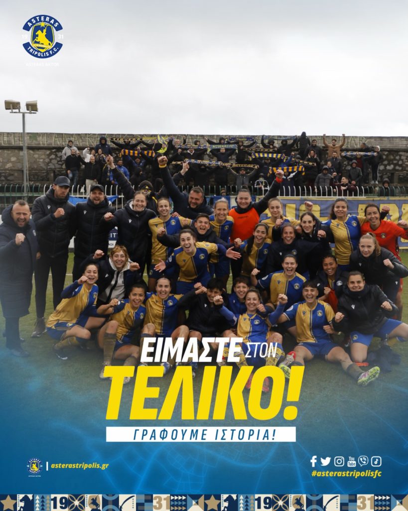 Μία, νέα, μεγάλη διάκριση για την γυναικεία ομάδα ποδοσφαίρου του Αστέρα της Τρίπολης. Μετά την άνοδό της στην Α Εθνική, ήρθε και η πρόκρισή της στον μεγάλο τελικό του Κυπέλλου Γυναικών Ελλάδας.