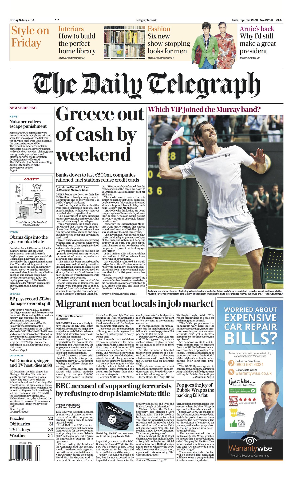 Η βρετανική εφημερίδα προαναγγέλει ότι τα «500 εκατομμύρια ευρώ που απομένουν ως αποθέματα στις ελληνικές τράπεζες θα στεγνώσουν καθώς συντρίβεται η ελληνική οικονομία». Ενδεικτικό χαρακτηρίζει η Telegraph,το γεγονός ότι «η ημερήσια αποζημίωση σε μετρητά από πολλά μηχανήματα ΑΤΜ έχει ήδη μειωθεί από €60 στα €50, επειδή έχουν εξαντληθεί τα χαρτονομίσματα των €20».