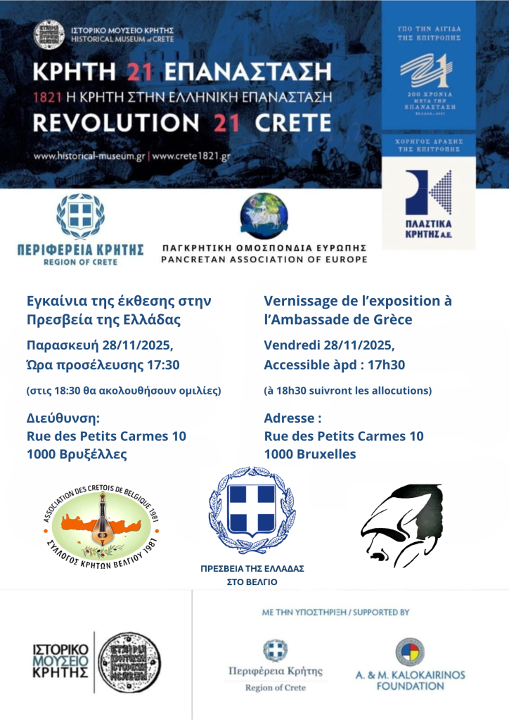 Έκθεση με θέμα «1821 Η Κρήτη στην Ελληνική Επανάσταση», διοργανώνουν η Πρεσβεία της Ελλάδας στο Βέλγιο, ο Σύλλογος Κρητών Βελγίου (ΣΚΒ) και το τοπικό παράρτημα της Διεθνούς Εταιρίας Φίλων Νίκου Καζαντάκη (ΔΕΦΝΚ).
