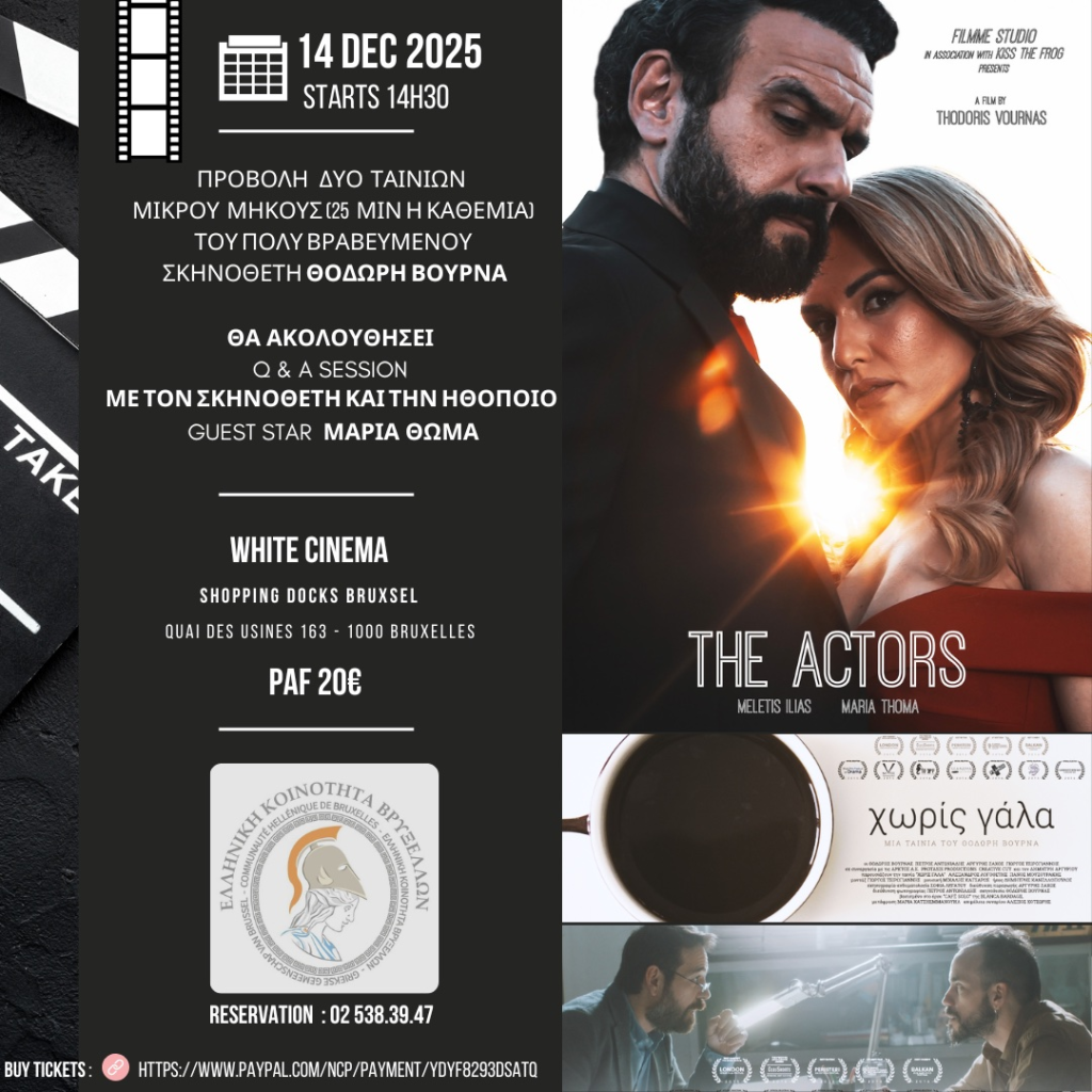 Η Ελληνική Κοινότητα Βρυξελλών σε συνεργασία με την ομάδα του σκηνοθέτη Θοδωρή Βουρνά, διοργανώνει προβολή των ταινιών μικρού μήκους «Χωρίς Γάλα» και «The Actors», στις 14 Δεκεμβρίου 2025, στο White Cinema στις Βρυξέλλες.