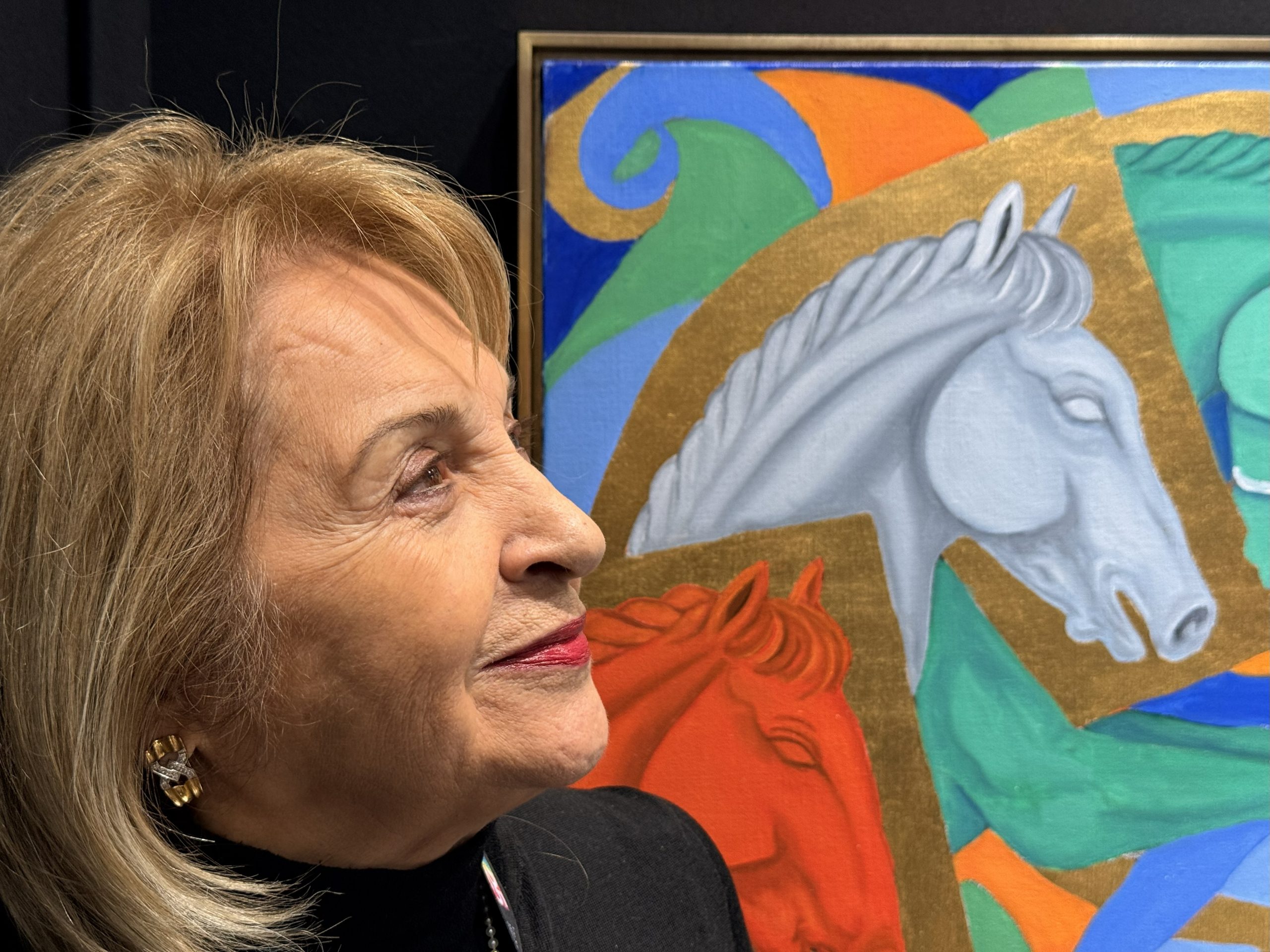 Με το χαρακτηριστικό της ιδίωμα – έντονα μπλε, χρυσά φύλλα, γεωμετρικά υπόβαθρα και άλογα που παλμογραφούν μια σχεδόν μυθολογική ενέργεια – η εικαστικός που ζει στις Βρυξέλλες από τις αρχές της δεκαετίας του ’80 επιβάλλει για ακόμη μία φορά μια απολύτως αναγνωρίσιμη «ελληνική» υπογραφή στην καρδιά της διεθνούς σκηνής.