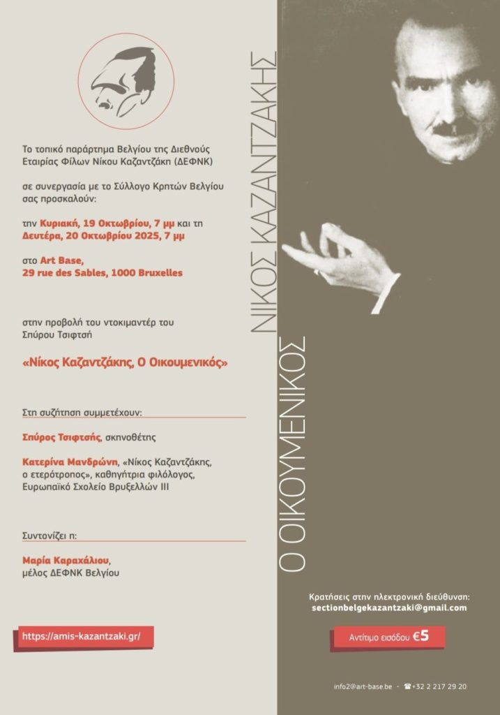 Δύο βραδιές αφιερωμένες στον μεγάλο Έλληνα στοχαστή και συγγραφέα, Νίκο Καζαντζάκη, διοργανώνει το Τοπικό Παράρτημα Βελγίου της Διεθνούς Εταιρείας Φίλων Νίκου Καζαντζάκη (ΔΕΦΝΚ), σε συνεργασία με τον Σύλλογο Κρητών Βελγίου.