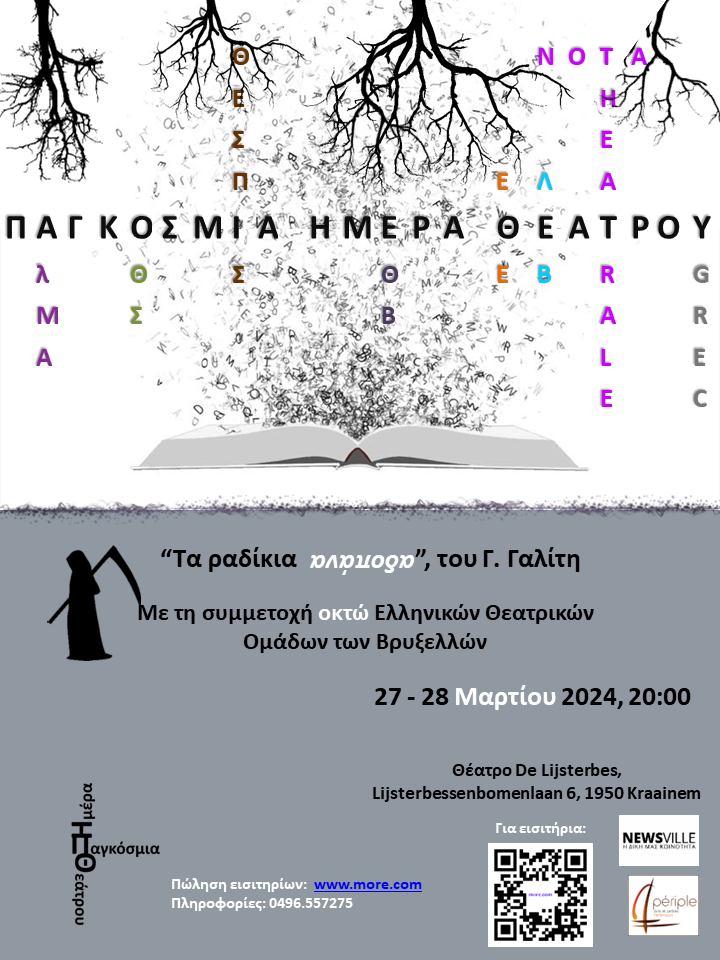 Την Παγκόσμια Ημέρα Θεάτρου θα γιορτάσουν οκτώ ελληνικές θεατρικές ομάδες του Βελγίου, παρουσιάζοντας την ξεκαρδιστική κωμωδία του Γιώργου Γαλίτη, “Τα ραδίκια ανάποδα”.