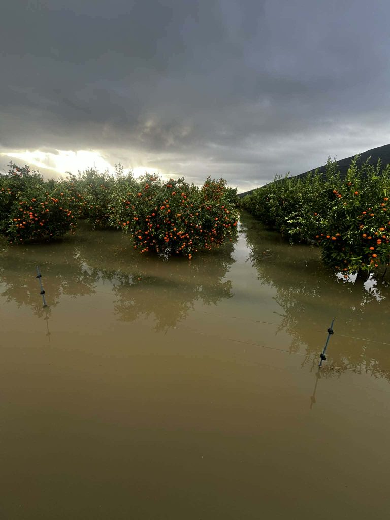 Οι πλημμύρες έχουν «καταπιεί» καλλιέργειες τριφυλλιού, πορτοκαλιές και λεμονιές, πολλές από τις οποίες βρίσκονταν ακόμη στη διαδικασία της συγκομιδής. Το νερό έχει εισχωρήσει βαθιά στα χωράφια, αφήνοντας πίσω του λασπόνερα και καταστροφή σε αγροτική παραγωγή και δέντρα.