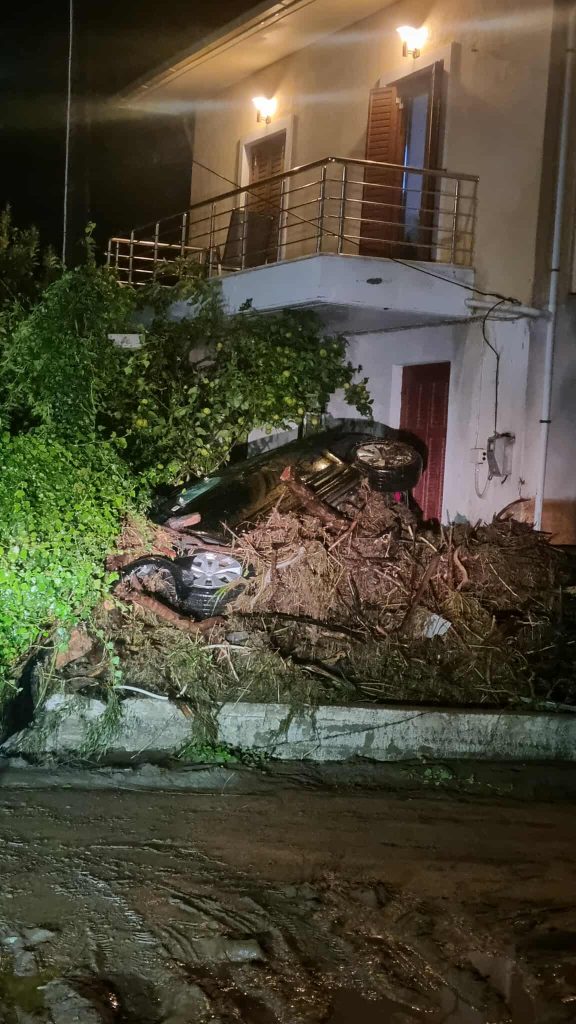 Τεράστιες είναι οι καταστροφές σε σπίτια και επιχειρήσεις, όπου το νερό έχει ξεπεράσει το 1,5 μέτρο, ενώ η ορμή του νερού παρέσυρε αυτοκίνητα, που κατέληξαν στις αυλές σπιτιών.