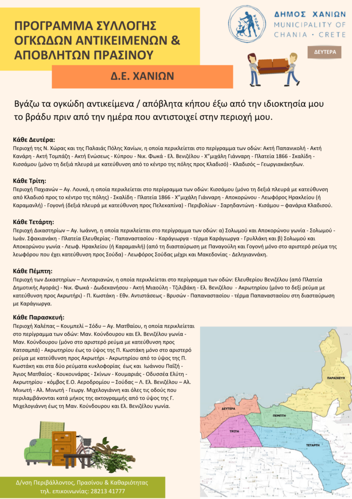 Ξεχωριστή πρόβλεψη για την περισυλλογή ογκωδών θα υπάρχει για τις περιοχές που εντάσσονται στη Δημοτική Ενότητα Χανίων, με το πρόγραμμα να διαμορφώνεται ως εξής: