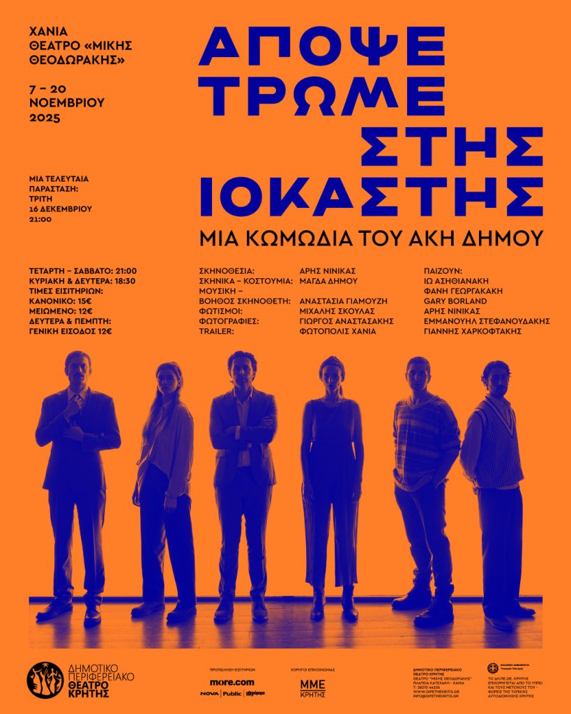 Το Δημοτικό Περιφερειακό Θέατρο Κρήτης παρουσιάζει την εκρηκτική κωμωδία του Άκη Δήμου «Απόψε τρώμε στης Ιοκάστης» σε σκηνοθεσία Άρη Νινίκα.