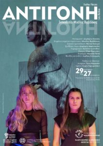 Το έργο, που παίζεται ήδη από τις 4 Νοεμβρίου στο θέατρο Κυδωνία ανέβηκε σε μετάφραση Δημήτρη Κιούση, σκηνοθεσία Μιχάλη Βιρβιδάκη μέσα στη σκηνική εγκατάσταση που δημιούργησε η αξιόλογη εικαστικός Νάντια Καλαρά και με τις δύο νέες ταλαντούχες ηθοποιούς της Δραματικής Σχολής του θεάτρου Κυδωνία στους πρωταγωνιστικούς ρόλους, Τόνια Κατσούλη (Αντιγόνη) και Σοφία Γαροφαλάκη (Ισμήνη).