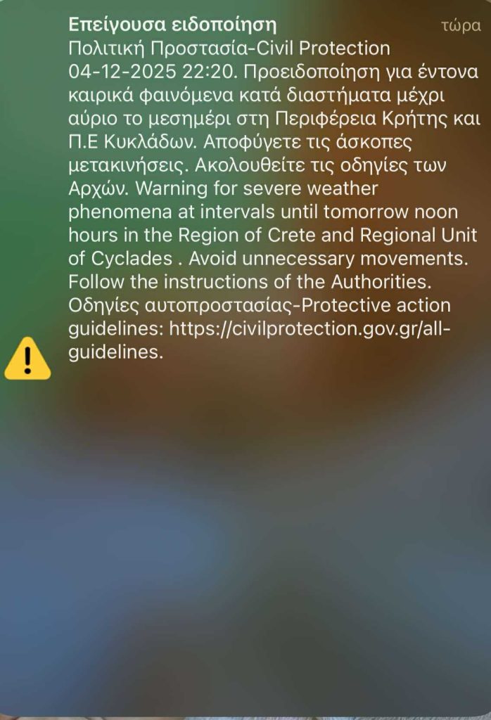 Στις 22:20 το βράδυ της Πέμπτης, ήχησε και σε όλες τις κινητές συσκευές μήνυμα του 112 που προειδοποιούσε για καιρικά φαινόμενα αυξημένης έντασης, ενώ καλούσε το κοινό να αποφύγει άσκοπες μετακινήσεις και να είναι σε εγρήγορση ακολουθώντας ενδεχόμενες νέες οδηγίες των αρμόδιων αρχών.