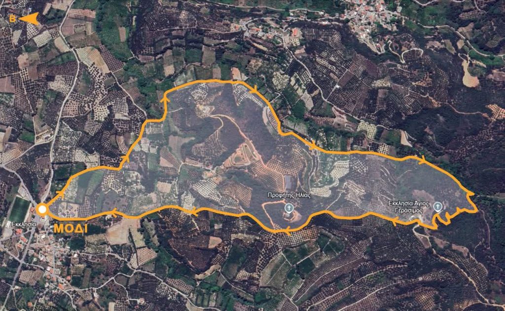 Οι πεζοπόροι θα ακολουθήσουν μια κυκλική διαδρομή 4,5 χιλιομέτρων περίπου, ήπιας δυσκολίας, (υπάρχουν δύο ανηφορικά σημεία των 150 περίπου μέτρων, το ένα με σκαλοπάτια) σε ένα καταπράσινο περιβάλλον και θα περάσουν από το Οικολογικό Θρησκευτικό Πάρκο Αγίου Γερασίμου, το σπήλαιο όπου έζησε για ένα διάστημα ο Άγιος Γεράσιμος.