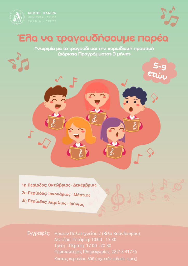 Ο Δήμος Χανίων, για ακόμη μία χρονιά, υλοποιεί το επιτυχημένο πρόγραμμα «Γνωριμία με το τραγούδι και τη χορωδιακή πρακτική», που απευθύνεται σε παιδιά ηλικίας 5 έως 9 ετών.